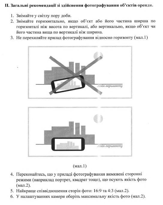 Фотографії об’єктів оренди або їх складових частин повинні бути кольоровими прямокутними (горизонтально чи вертикально) з розподільчою здатністю не менше ніж 1200 ї 630 пікселів на один дюйм.